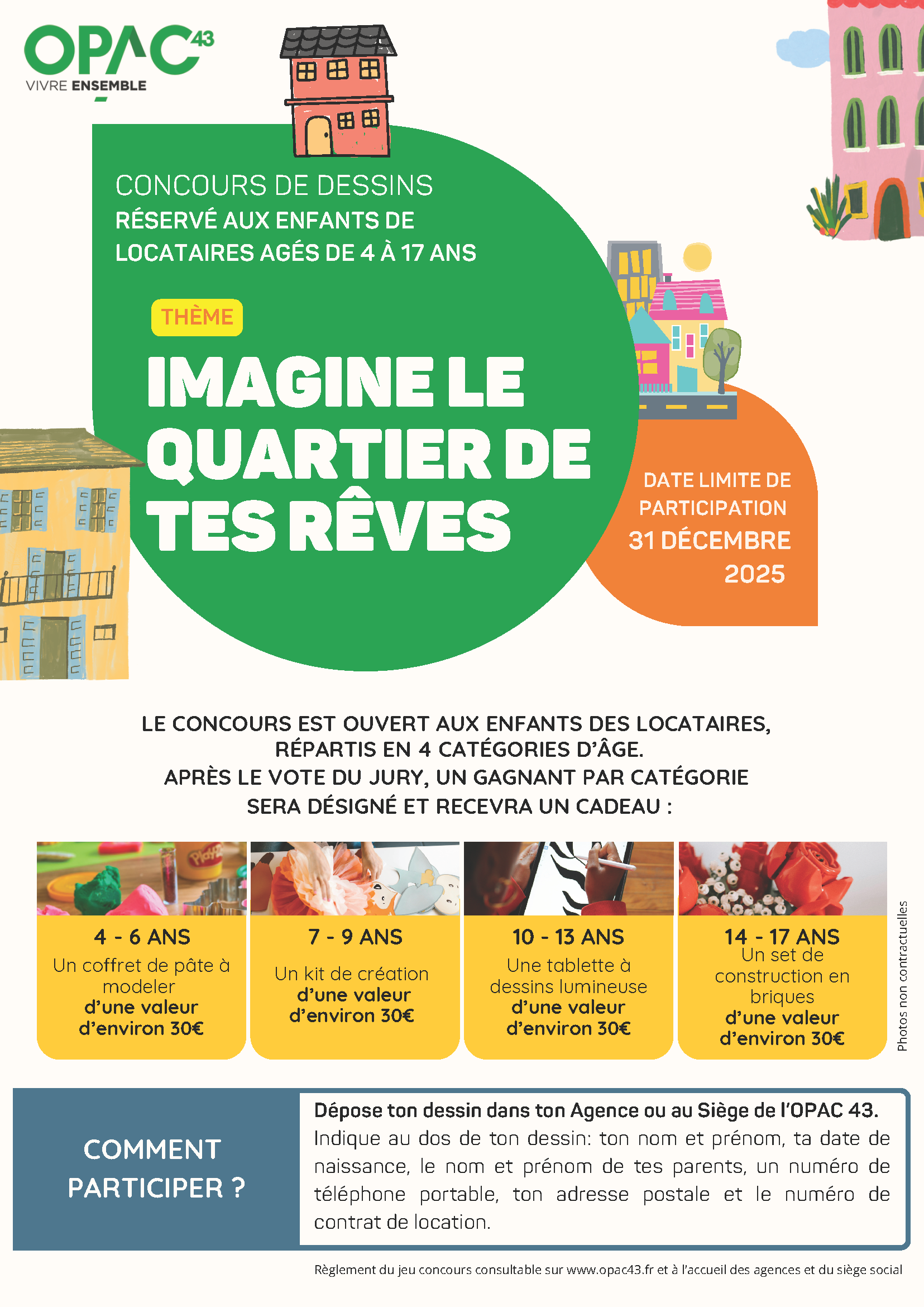Pour participer, il suffit de déposer le dessin et le bulletin de participation complété auprès de votre agence ou au siège de l’OPAC 43 avant le 31 décembre 2025.